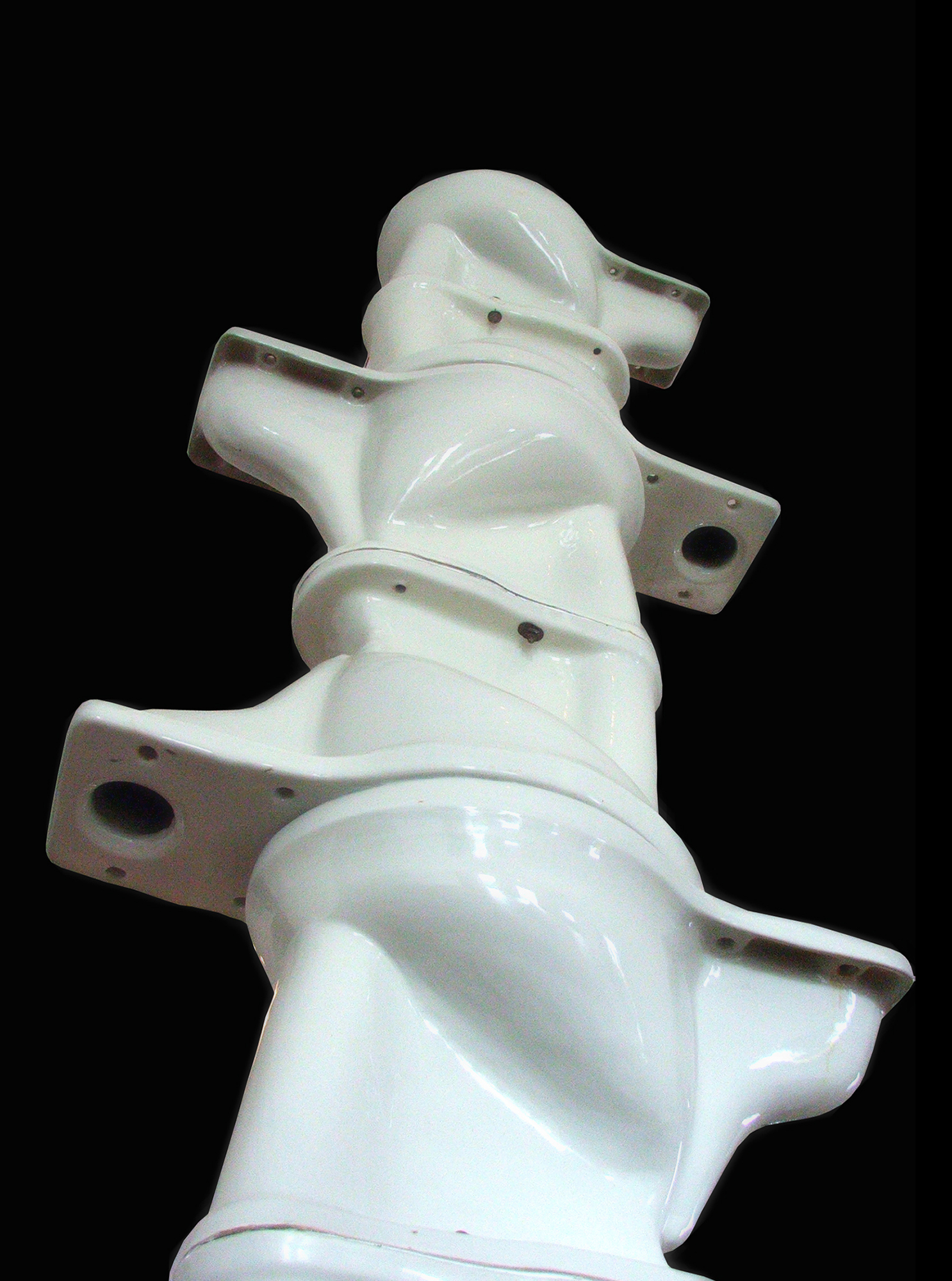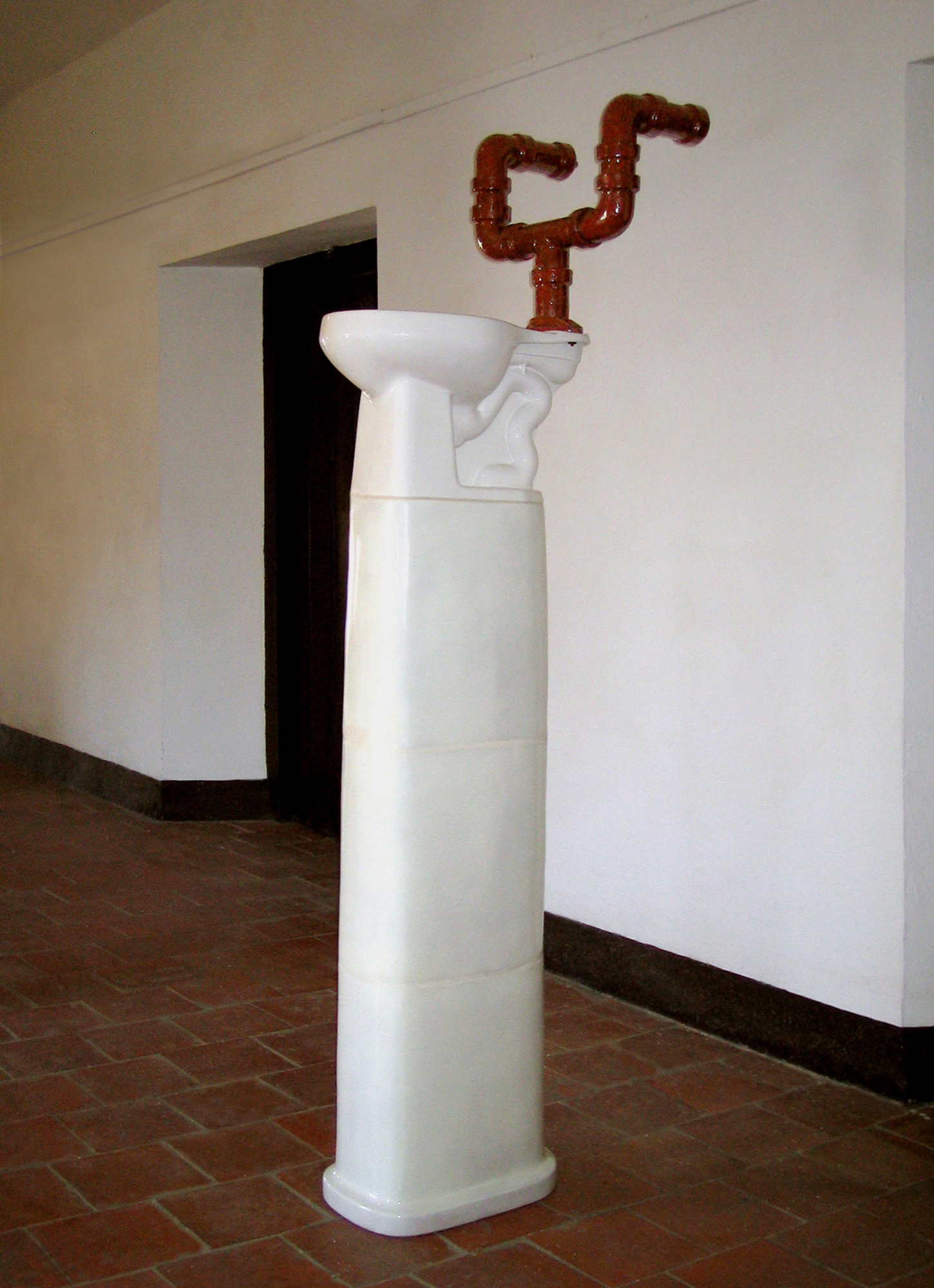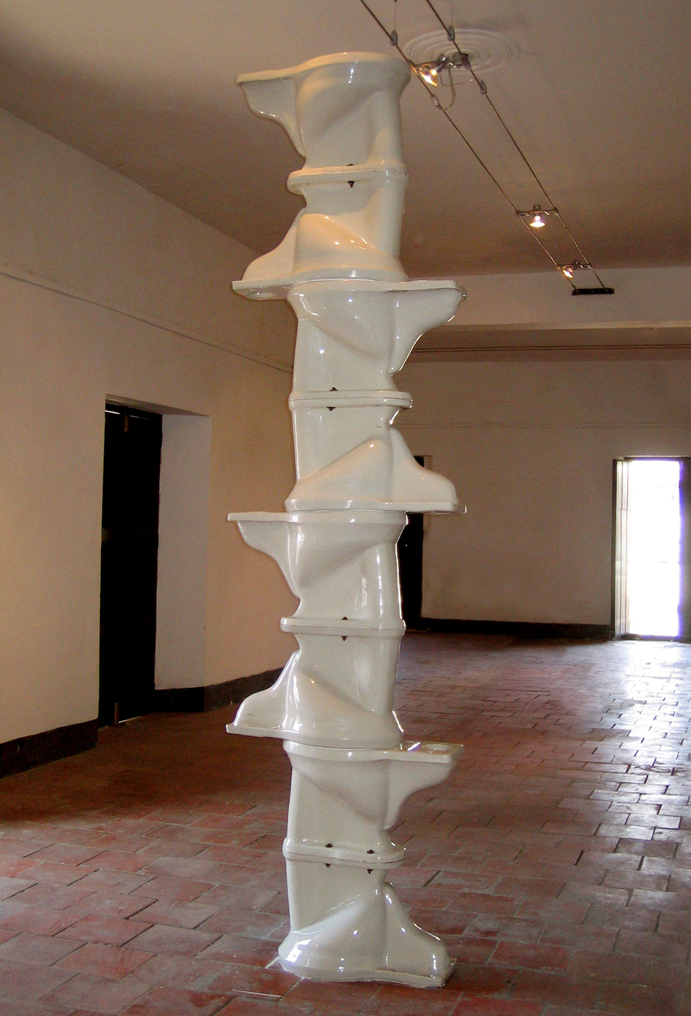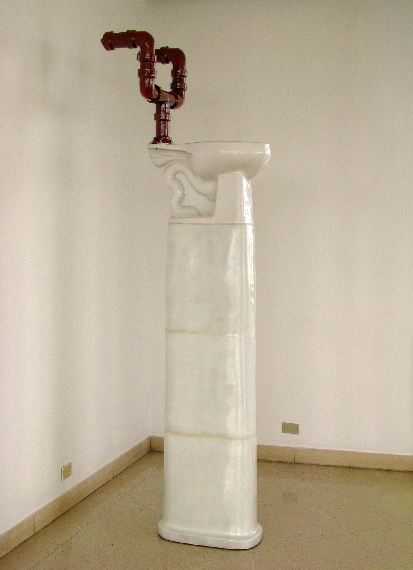 Industrial toilet bowl, stoneware, glazes, metal, and advesives; 97 x 33.5 x 22 inches.