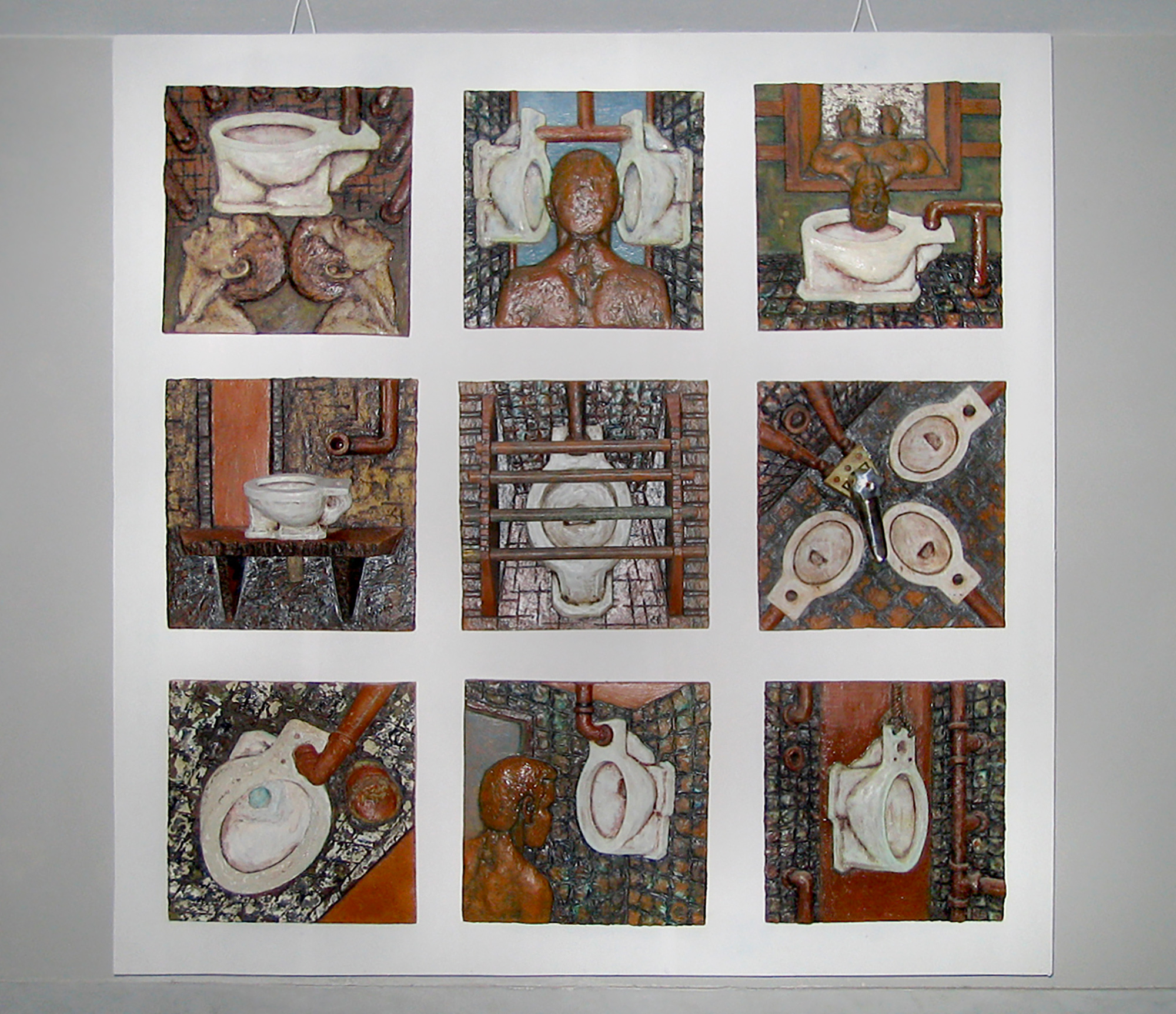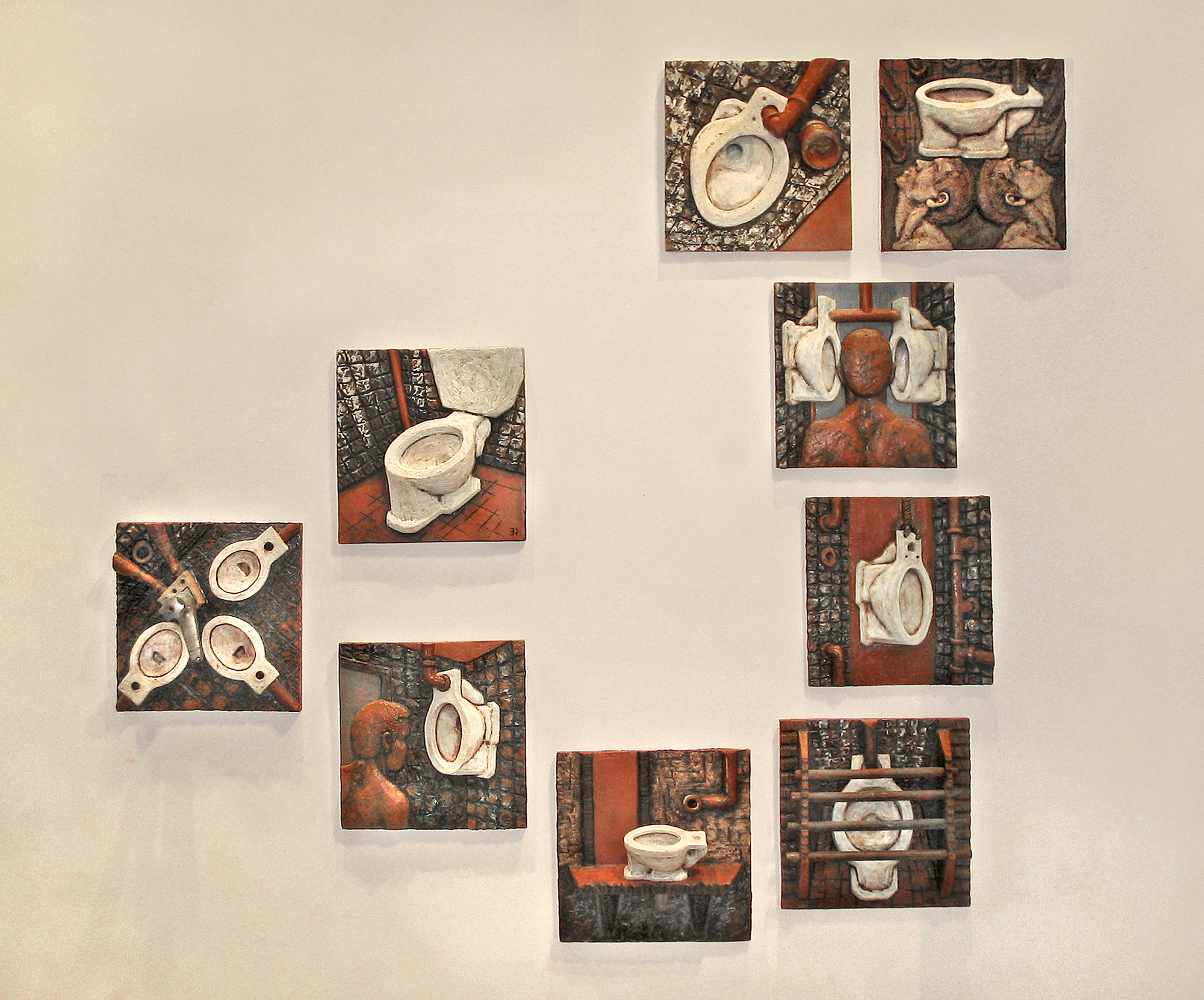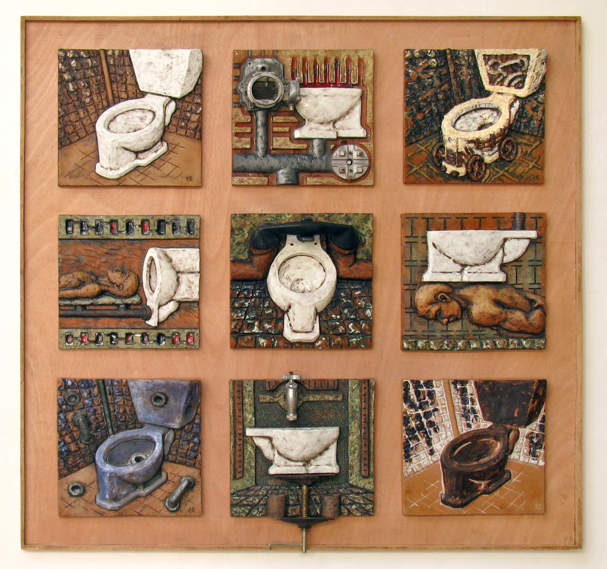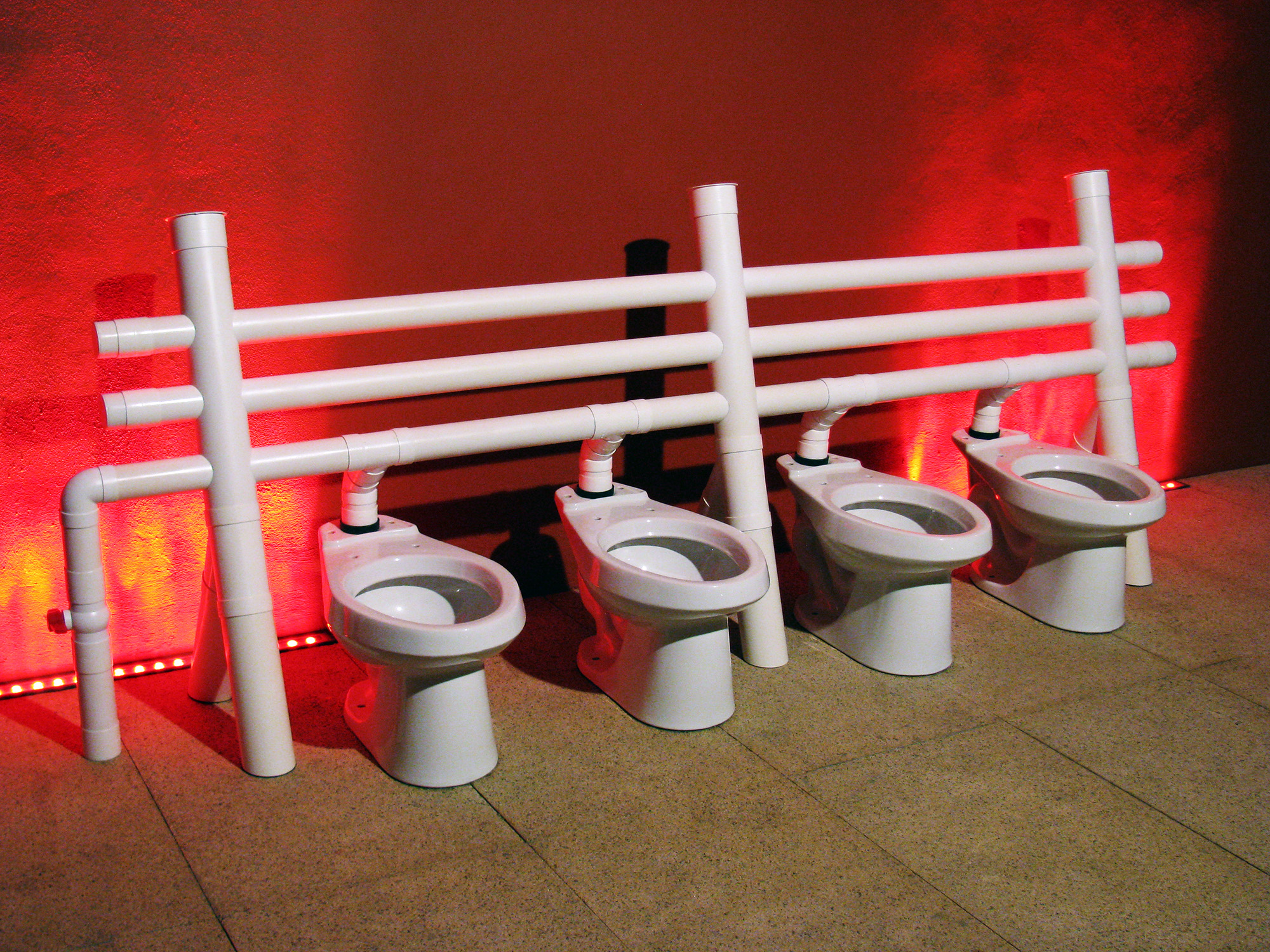 Industrial toilet bowls, stoneware, glazes, metal, and advesives; variables sizes.