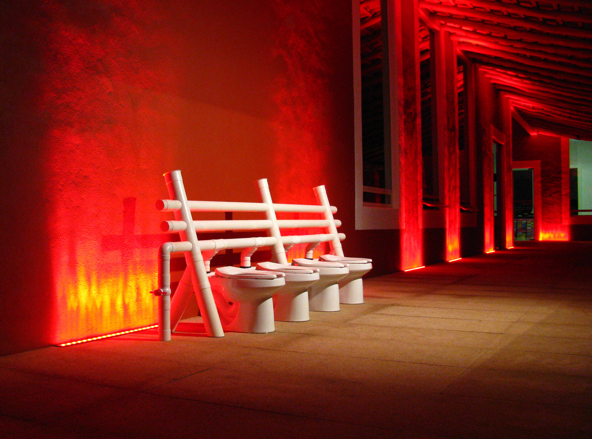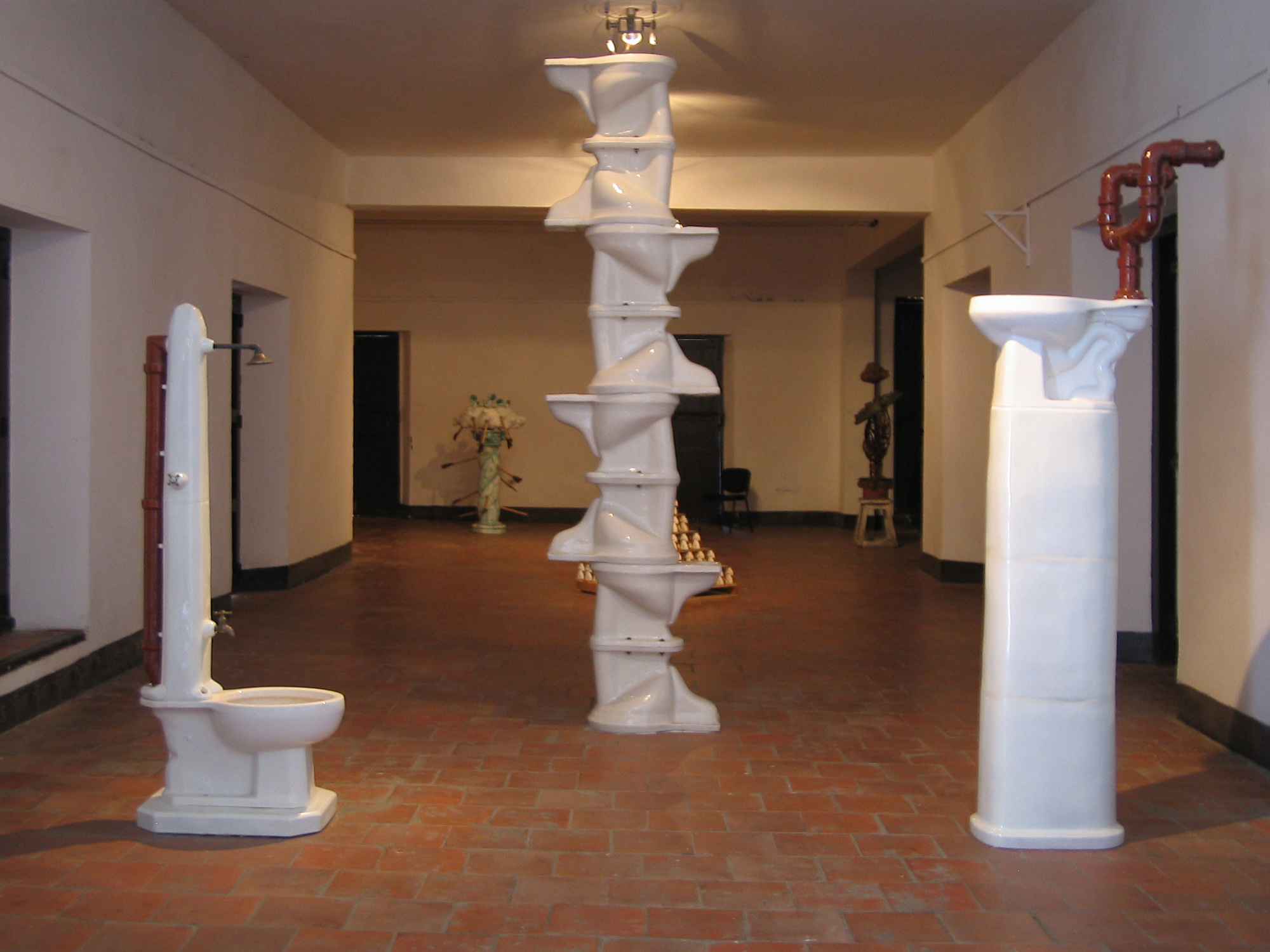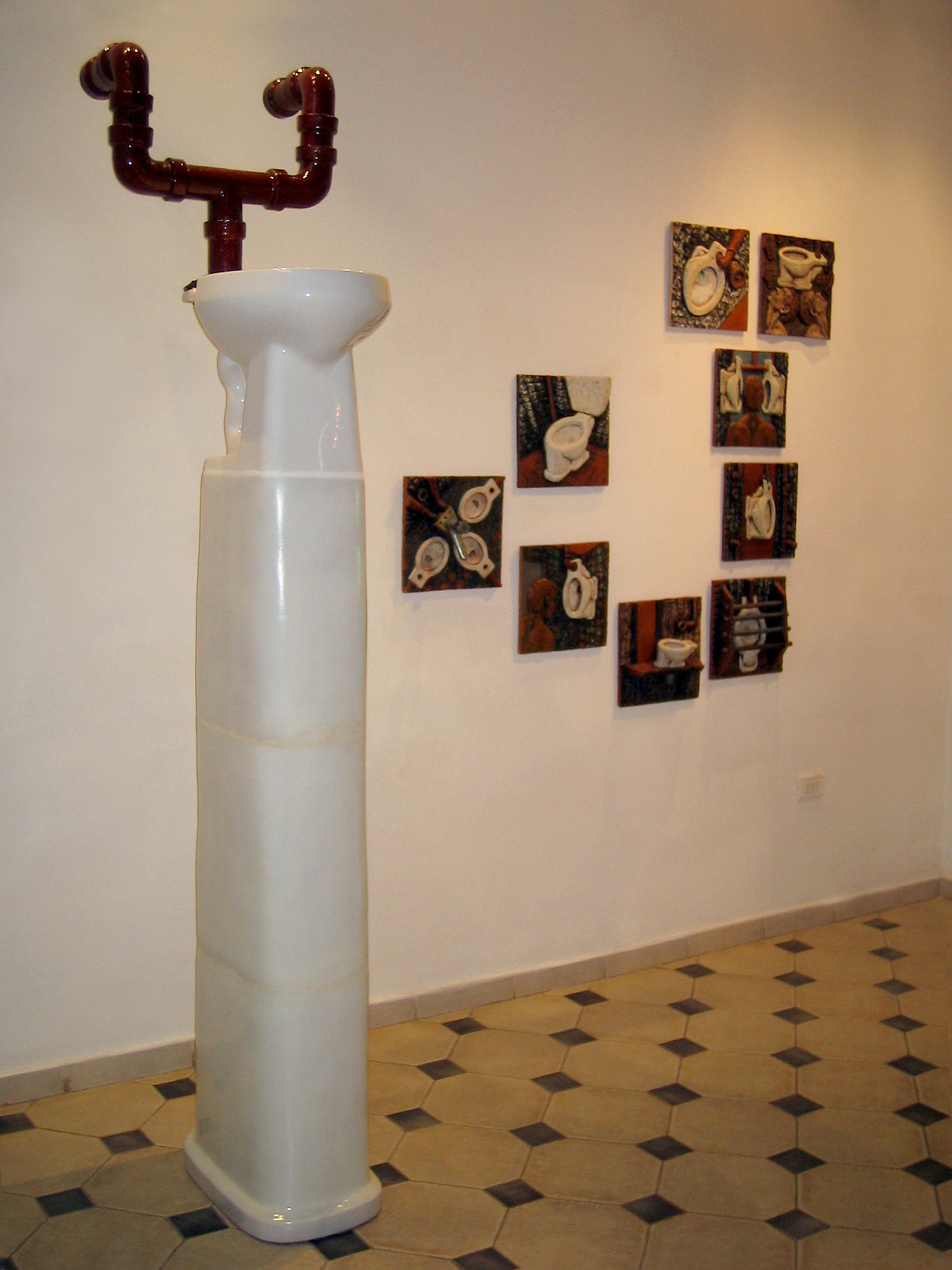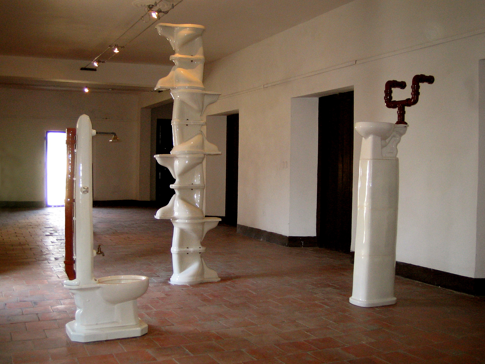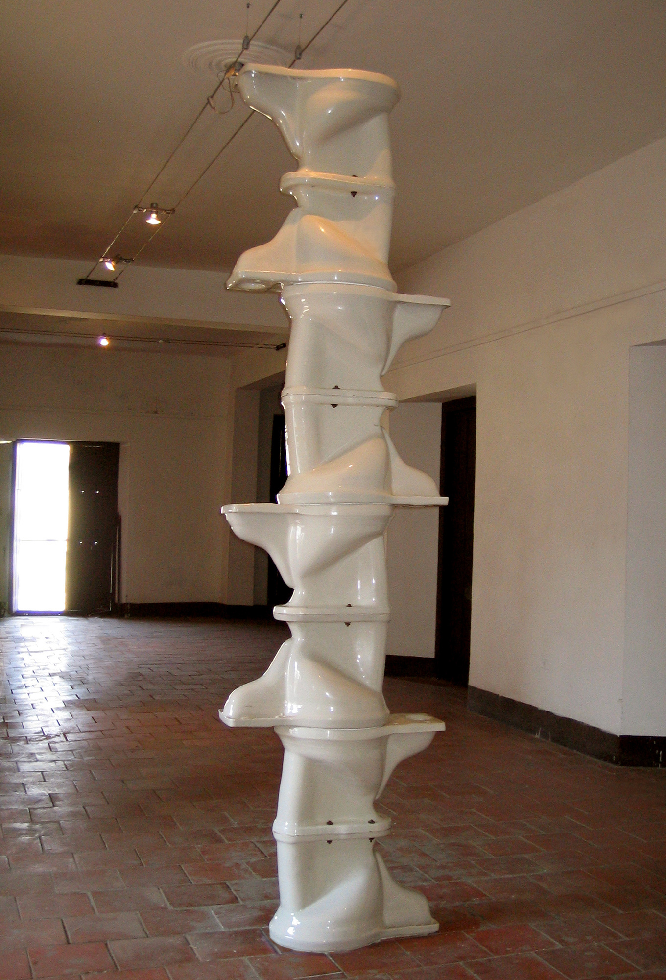Industrial toilet bowls, stoneware, glazes, metal, and advesives; variables sizes.