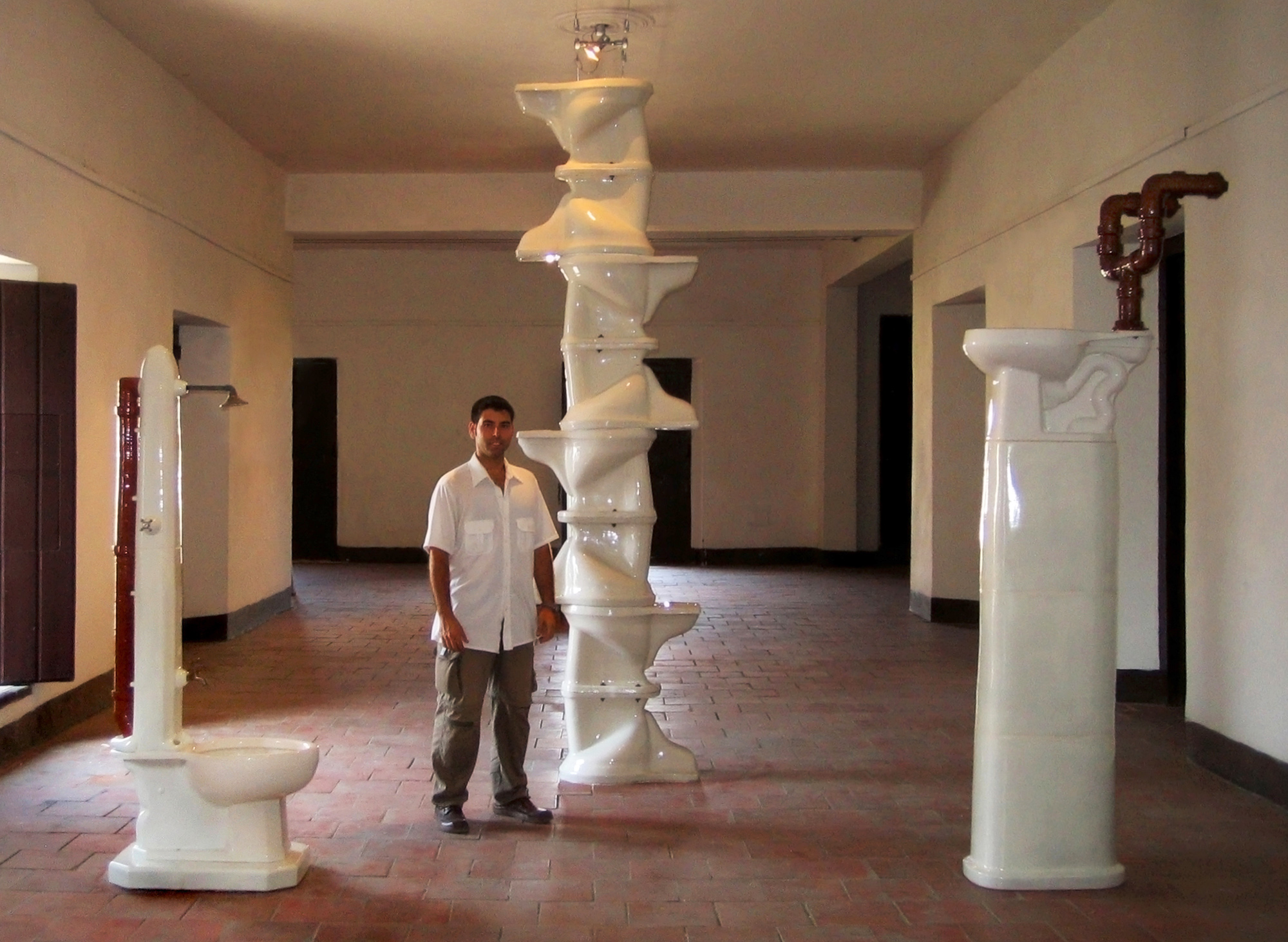 Industrial toilets, tubes of PVC, adhesives, and concrete; 48 x 120 x 32 inches.