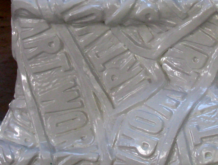 Ceramic tiles. Earthenware/Cone 04 Oxidation, found objects; 12 x 12 x 1 inches (single tiles).