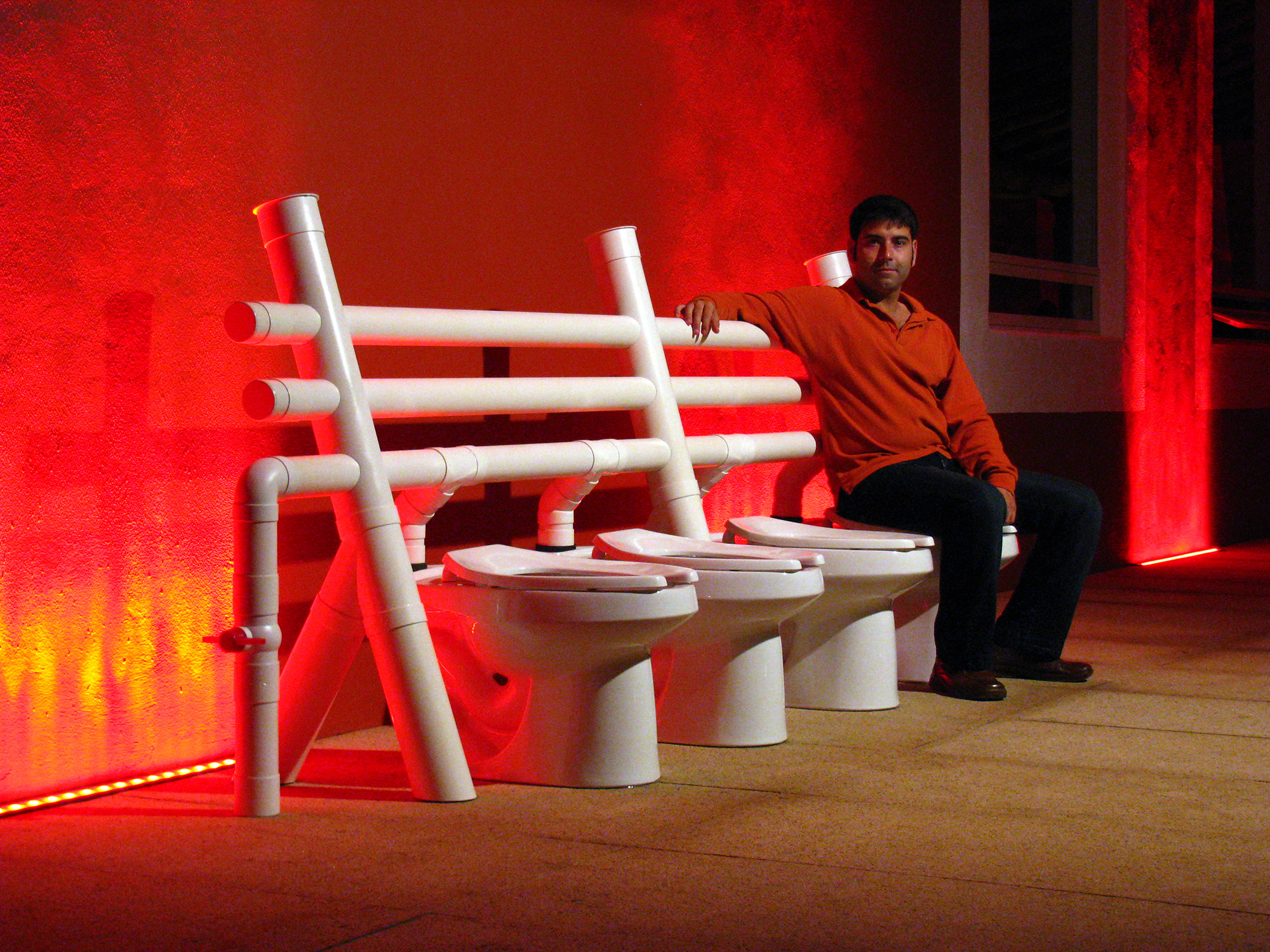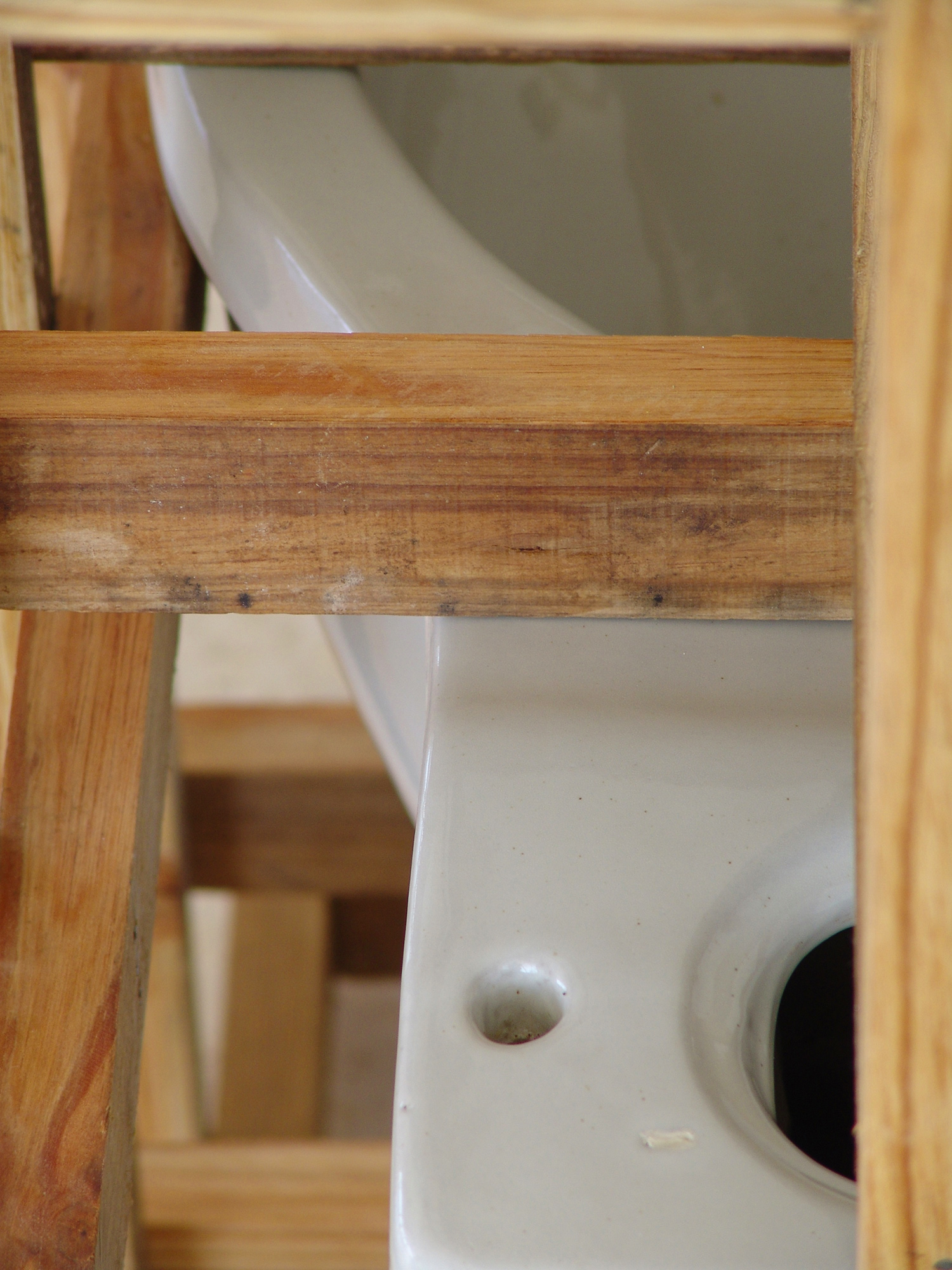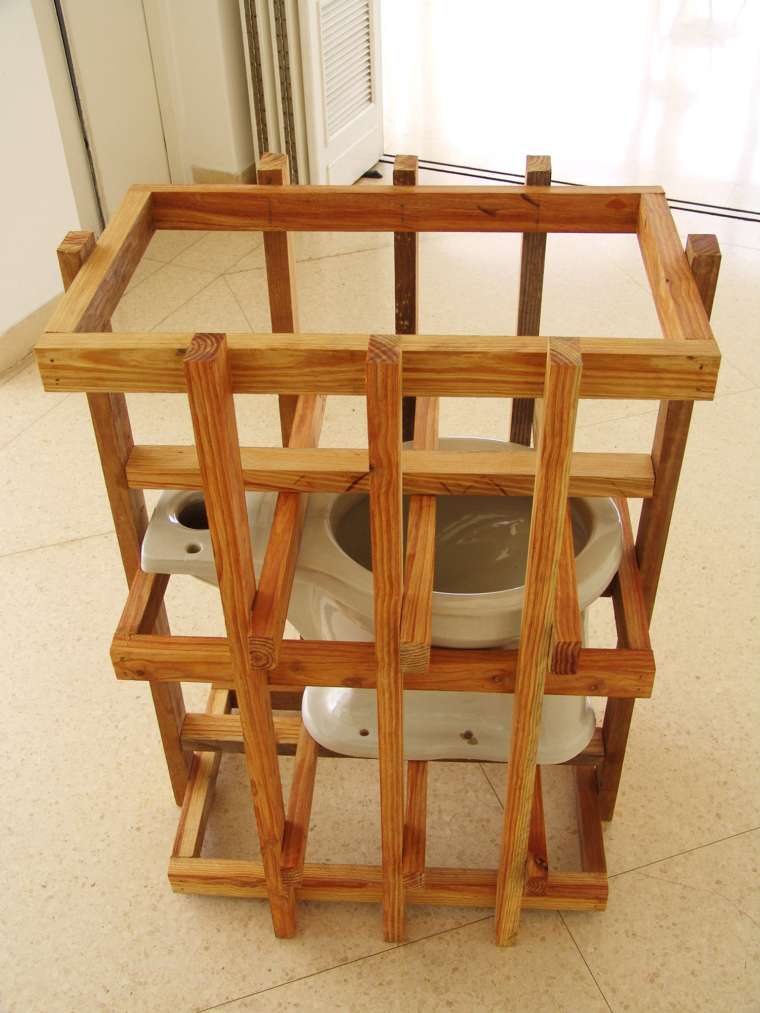 Industrial toilet bowl, wood, metal, adhesives; 84 x 39 x 30 inches.
