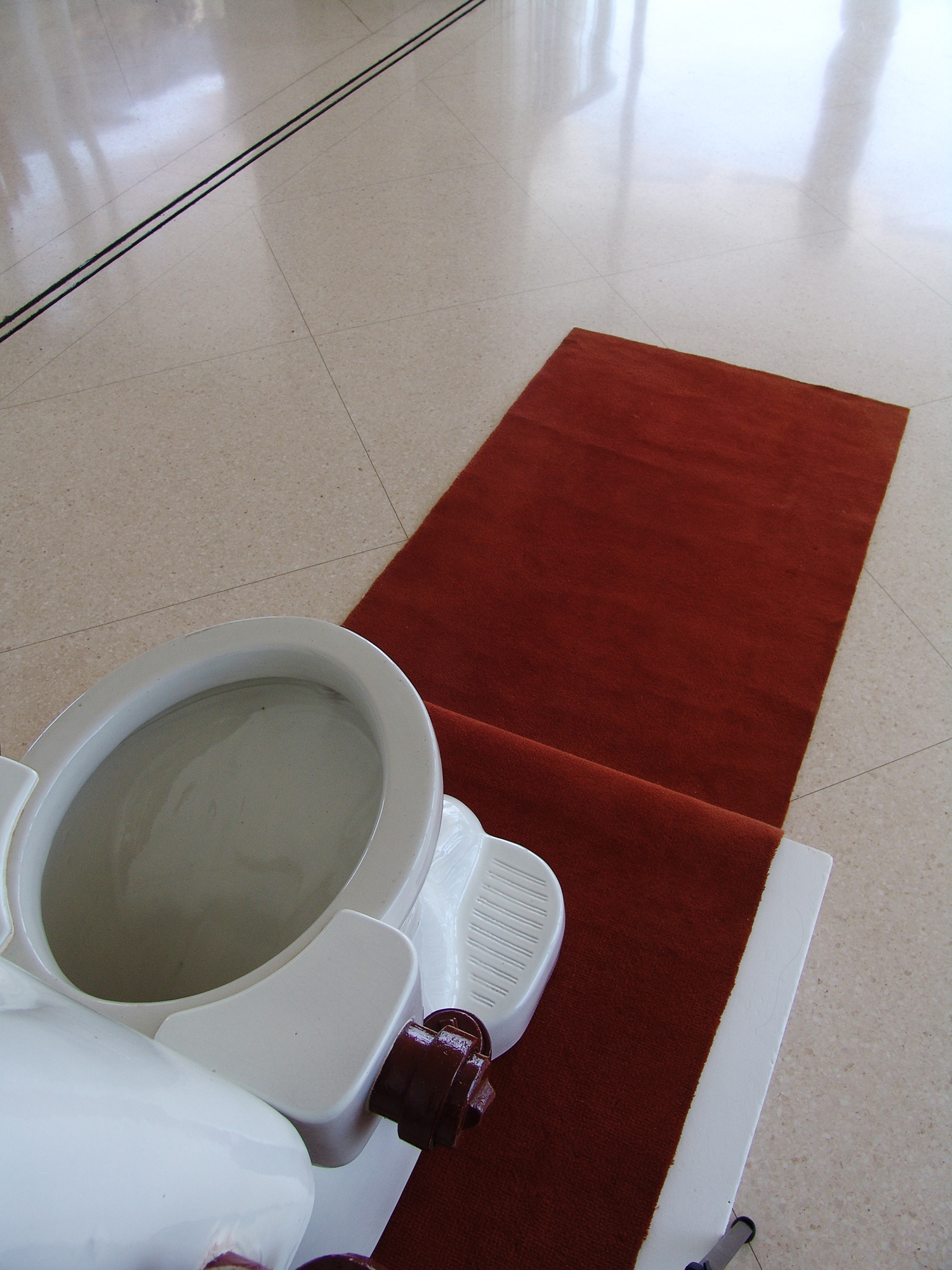 Industrial toilet bowl, stoneware, glazes, carpet, and advesives; 60 x 47 x 124 inches.